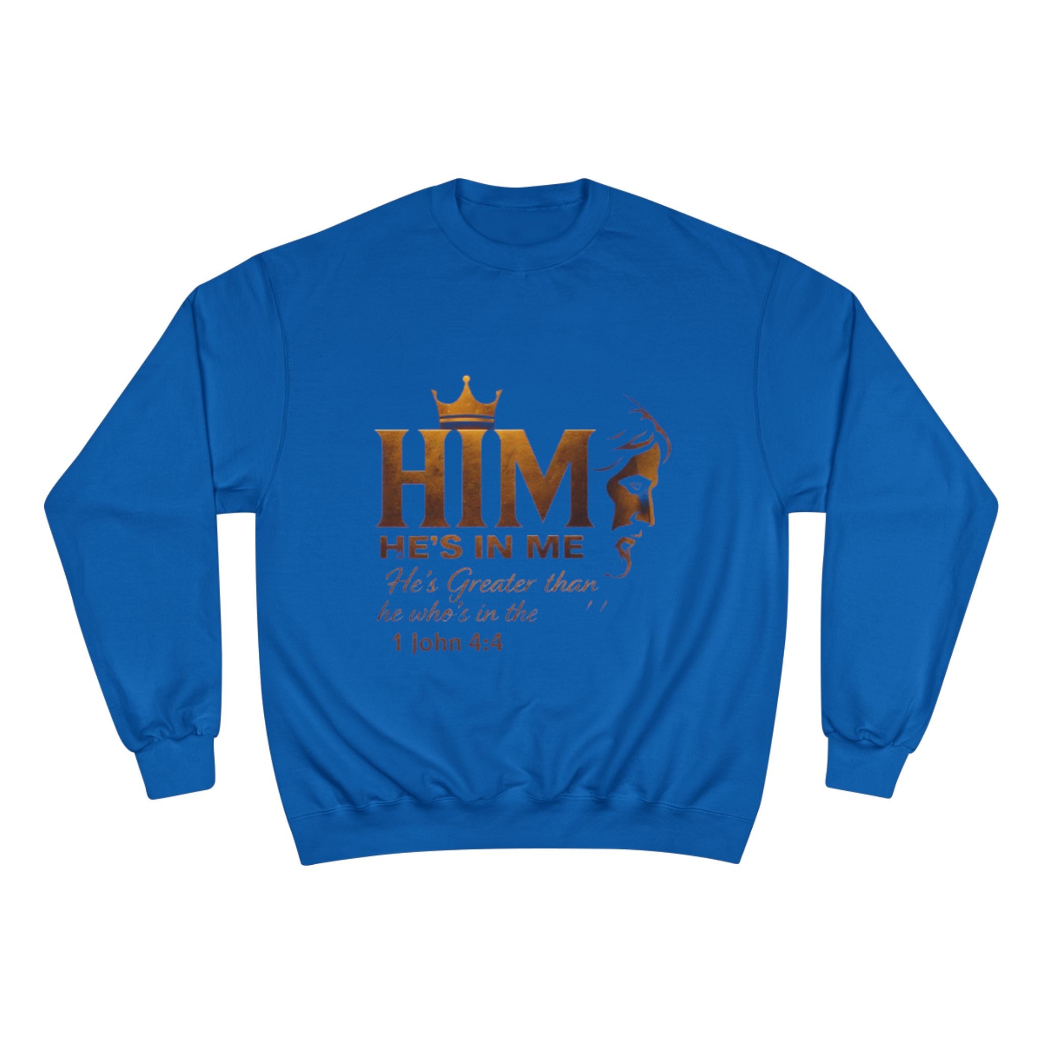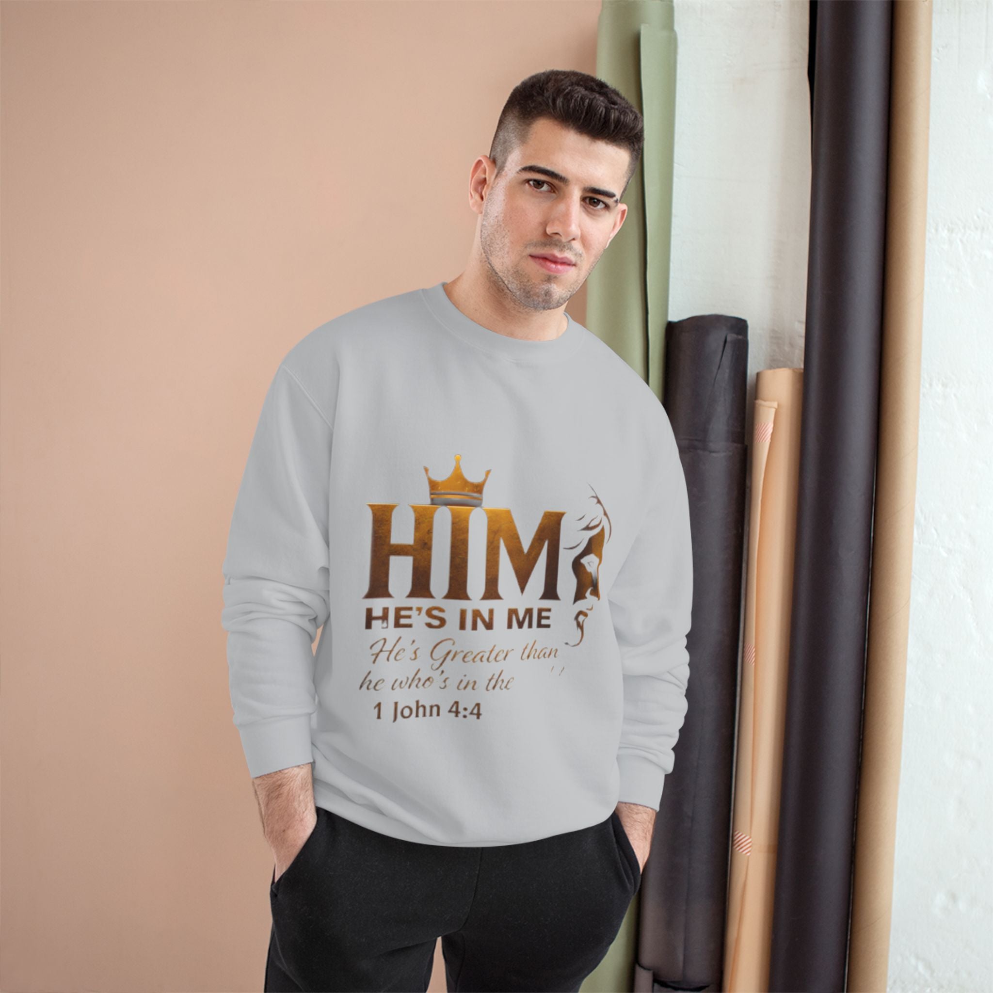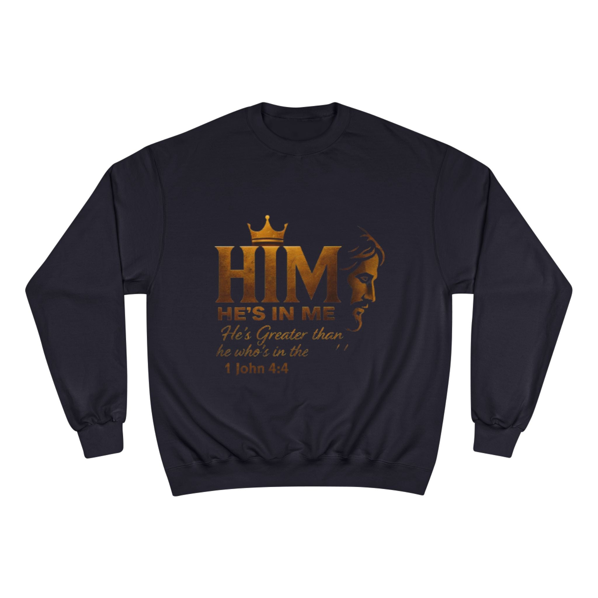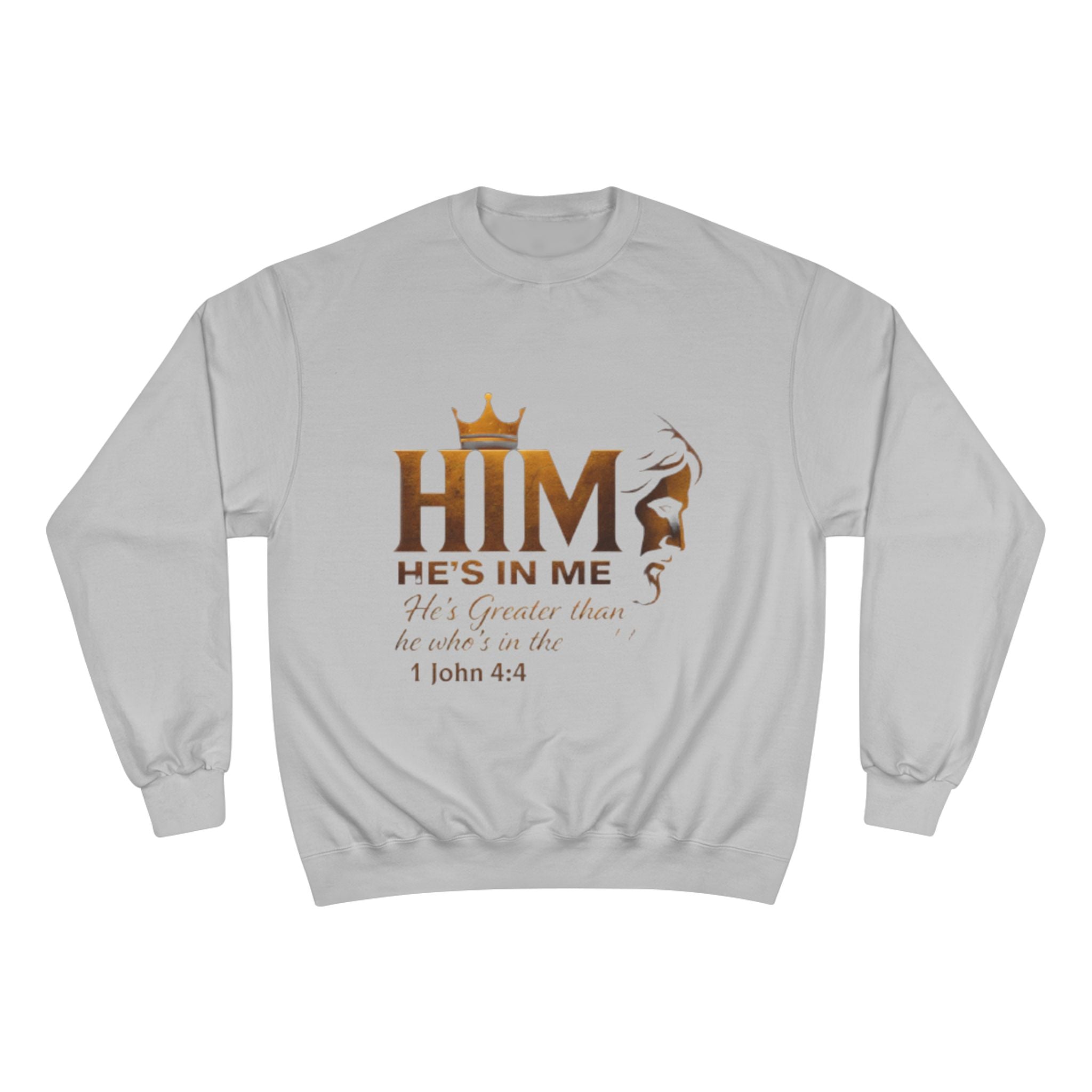 Soft, steady, and simple — this sweatshirt carries a quiet declaration of faith across its chest. A warm gold crown sits above the bold letters “HIM,” with an elegant lion silhouette and the script line “He’s in me” beneath, followed by the comforting verse reference 1 John 4:4. The crewneck’s medium-heavy blend drapes with structure and holds printed artwork clearly, while ribbed cuffs and hem keep the silhouette tidy through daily wear. It’s the kind of layer you reach for on reflective mornings, for community gatherings, or when you want your walk, volunteer shift, or small-group night to speak a gentle, confident message without words. Thoughtful details — like durable overlocked seams, a tubular knit body that reduces side seams, and a sewn-in label with a small sleeve “C” emblem — make it feel reliable long after the print has become part of your regular rotation.