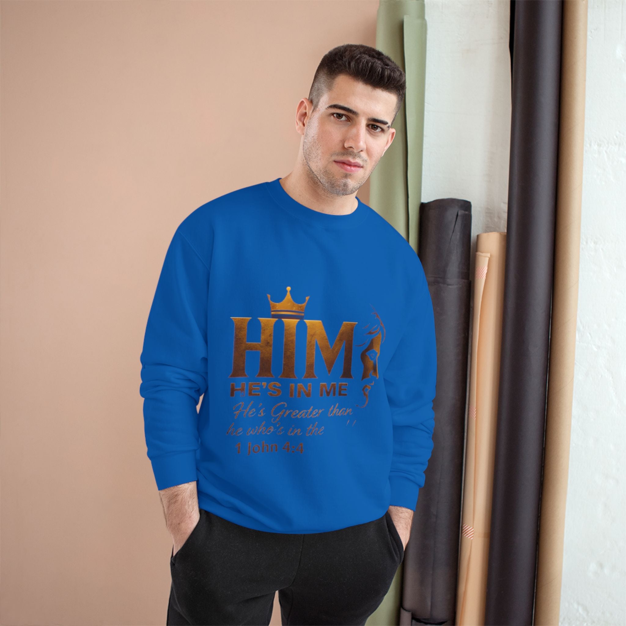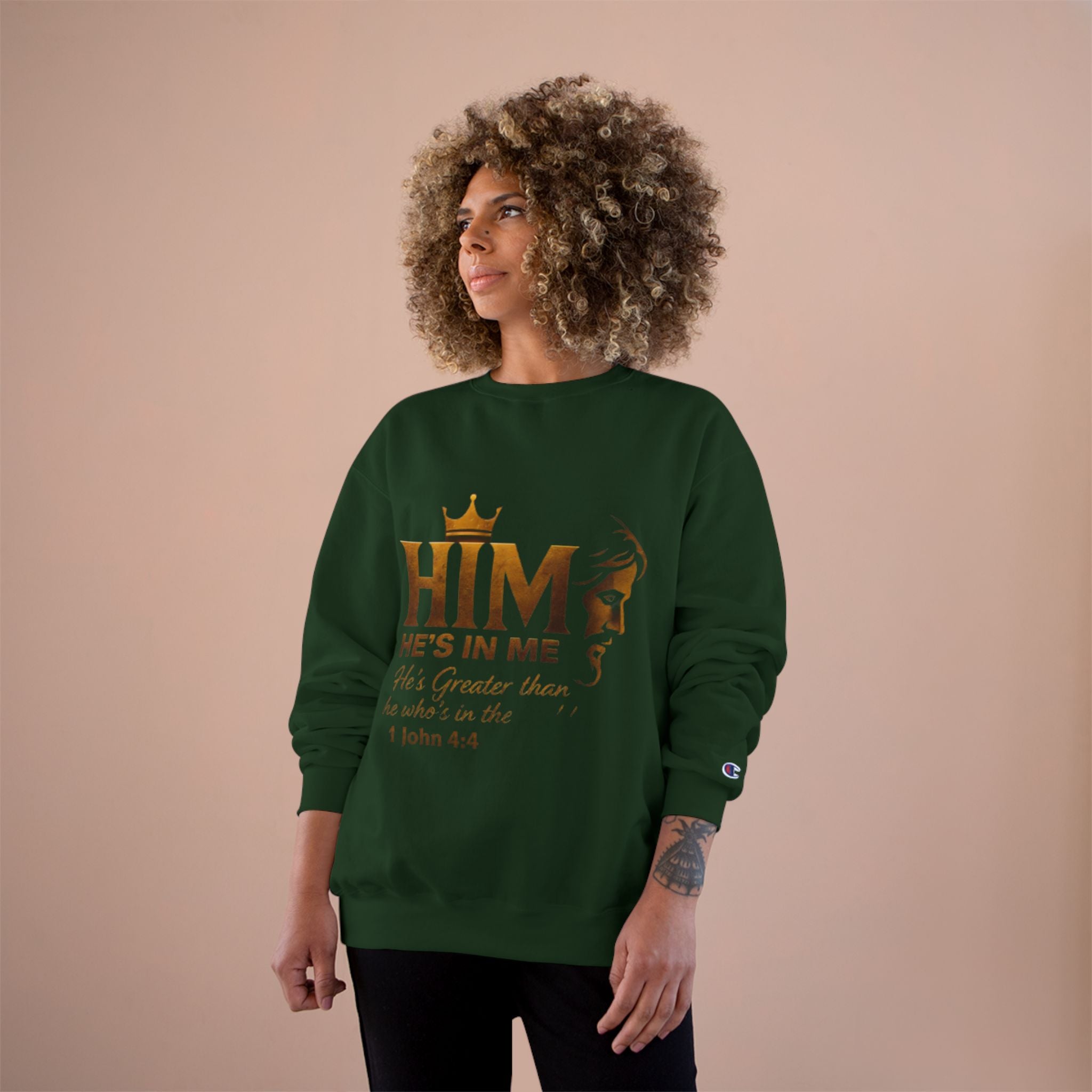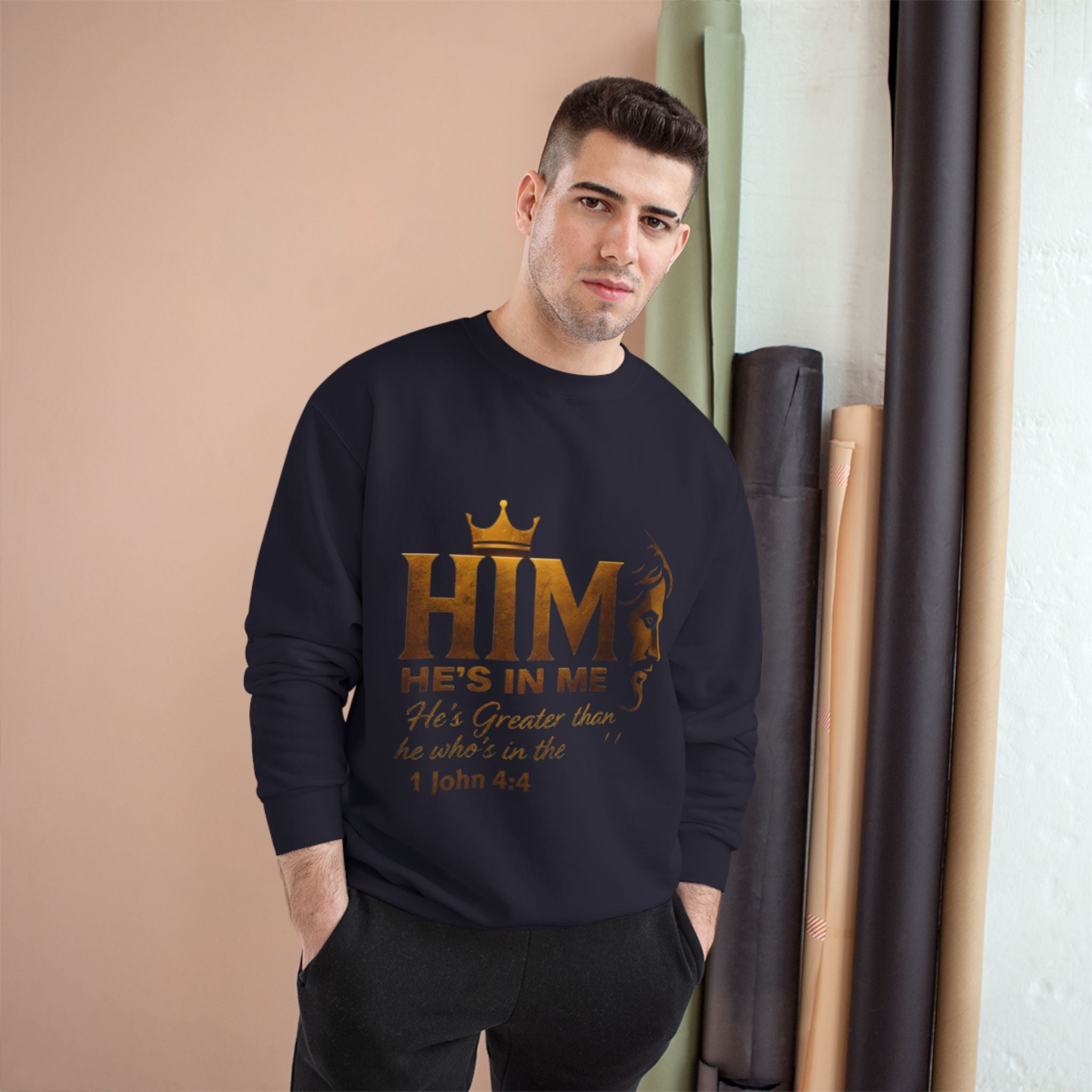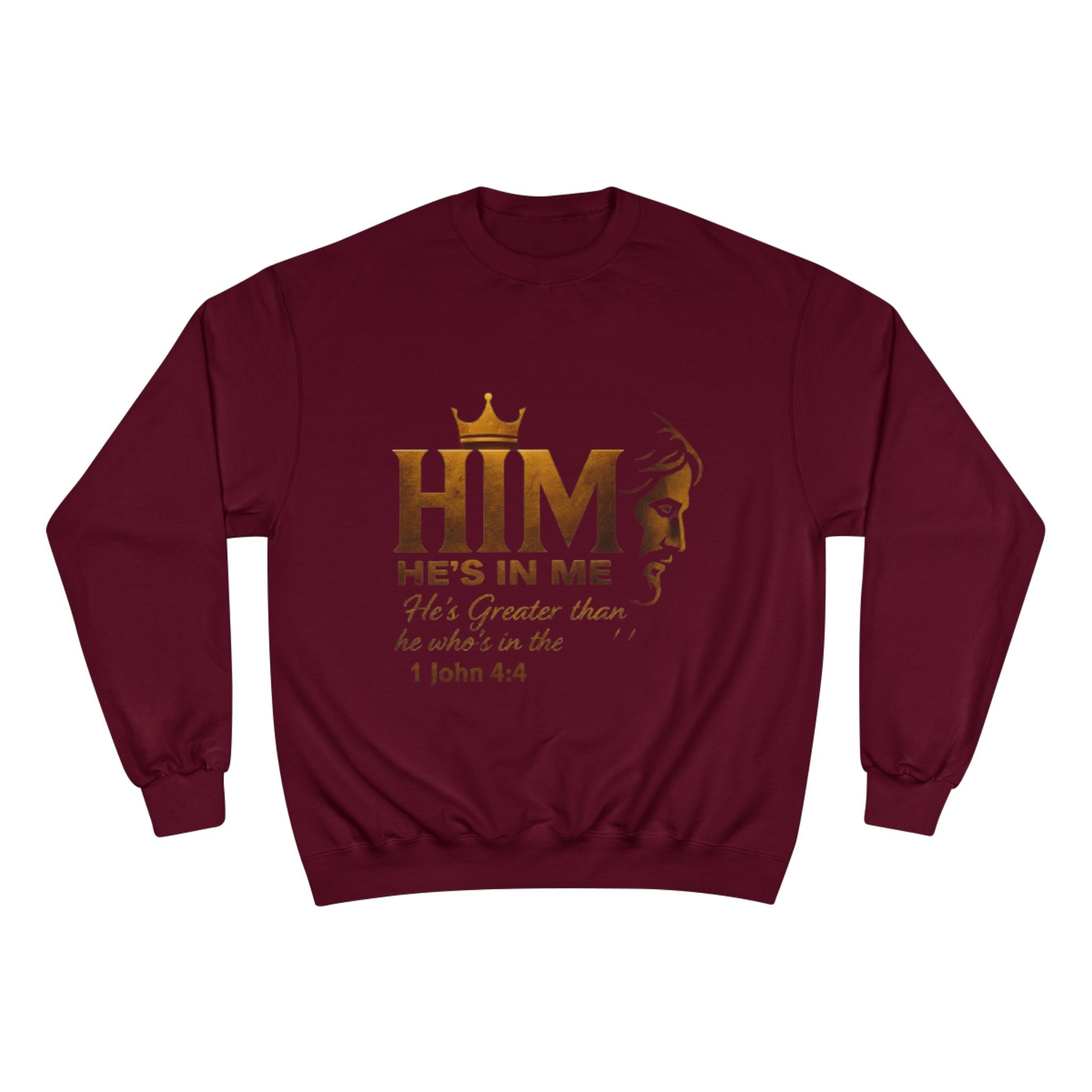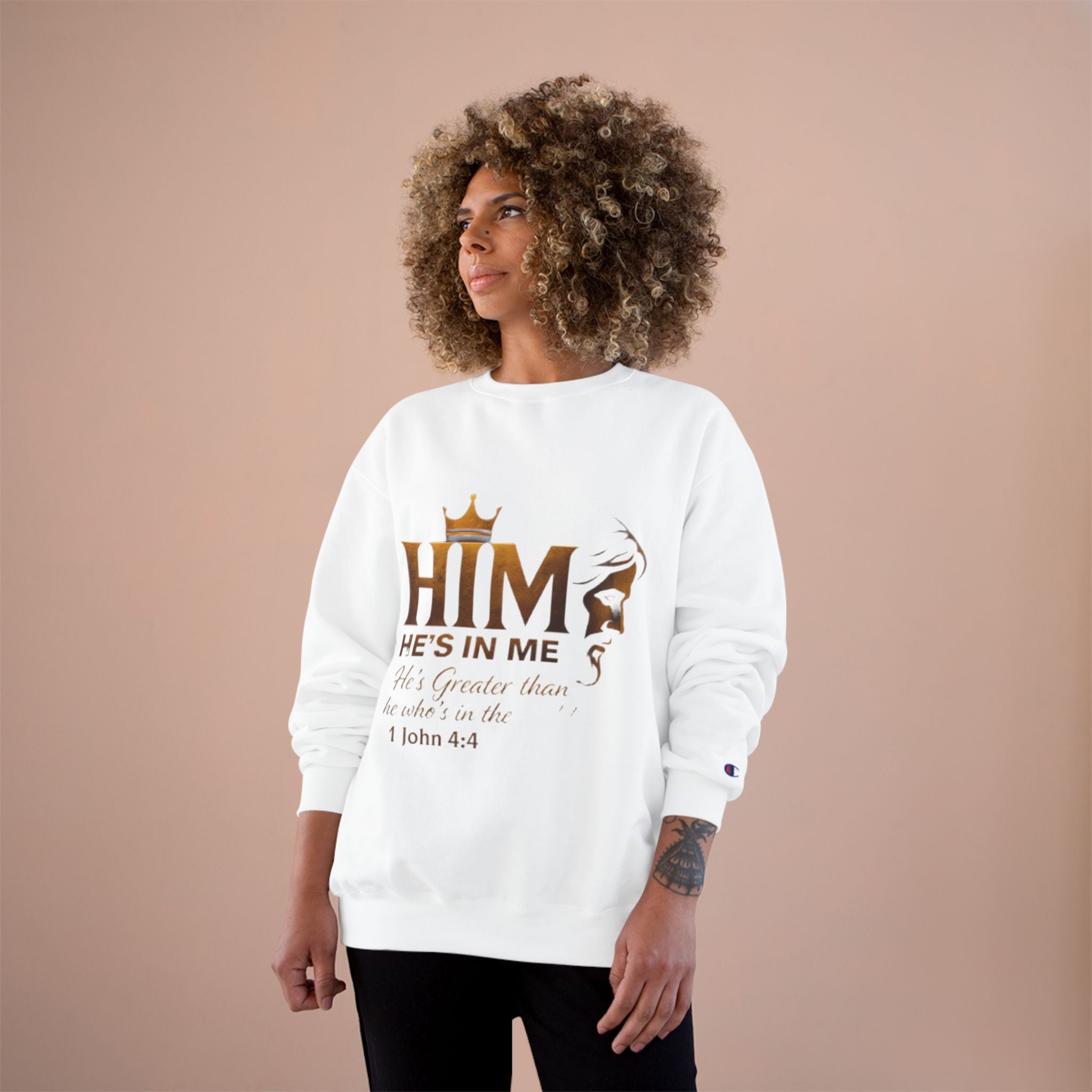 Soft, steady, and simple — this sweatshirt carries a quiet declaration of faith across its chest. A warm gold crown sits above the bold letters “HIM,” with an elegant lion silhouette and the script line “He’s in me” beneath, followed by the comforting verse reference 1 John 4:4. The crewneck’s medium-heavy blend drapes with structure and holds printed artwork clearly, while ribbed cuffs and hem keep the silhouette tidy through daily wear. It’s the kind of layer you reach for on reflective mornings, for community gatherings, or when you want your walk, volunteer shift, or small-group night to speak a gentle, confident message without words. Thoughtful details — like durable overlocked seams, a tubular knit body that reduces side seams, and a sewn-in label with a small sleeve “C” emblem — make it feel reliable long after the print has become part of your regular rotation.